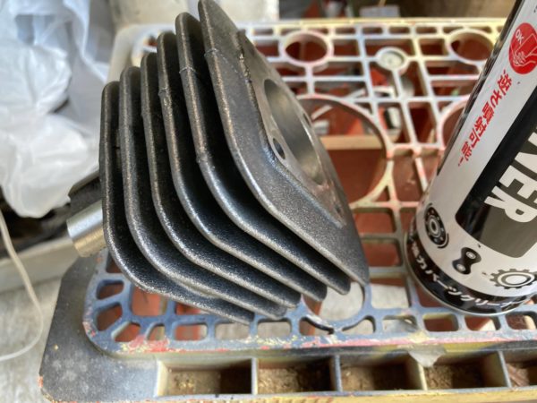 パーツクリーナーで冷却フィンに付着している油を落としてからマスキングテープで中に耐熱塗料が入らない様にします。すでに錆が出てしまっているシリンダーはサンドブラスターで錆を落としてから施工した方が良いでしょう。