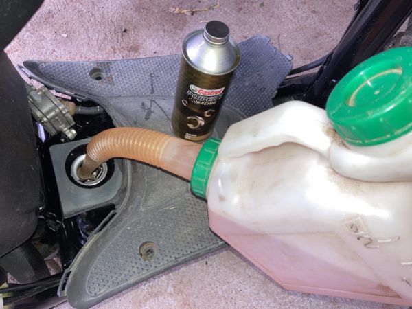 更に、焼き付き防止と潤滑を兼ねて燃料タンクにも「カストロールパワー1レーシング」を100:1の割合で混合したガソリンを給油しました。