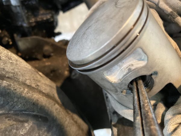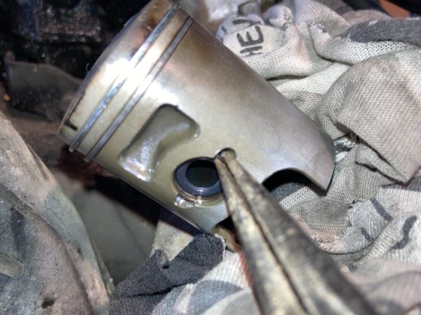 これは50ccのピストンを外した時の写真ですが、クランク内にピストンピンを止めているリングを落とさない様にウエスを穴に詰めてから作業しましょう。