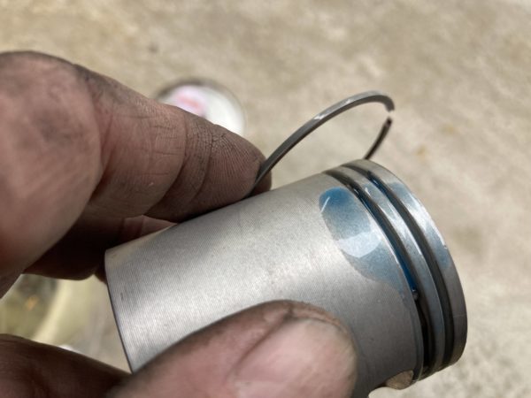 2ストエンジンオイルをたっぷり塗ってからピストンリングをはめます。