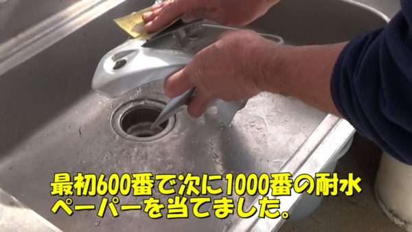 まずは水を流しながら600番の耐水ペーパーを当てます。小さな傷は削ってしまいましょう。次に1000番の耐水ペーパーで全体をなめらかにします。元々の艶が無くなる様に全体をザラザラにします。
