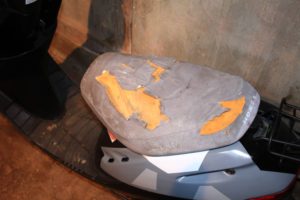 練習用に仕入れたスーパーディオですが、廃車置場で部品取りになっており、長年野ざらしにされていた事もありシートがボロボロでした。