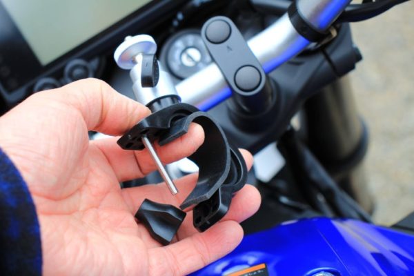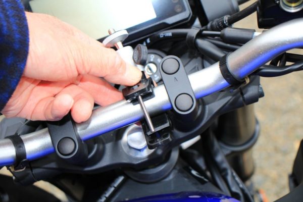 私のMT-03ABSの様にパイプハンドルのバイクだったら簡単です。ハンドルに挟み込んで取り付けが出来るタイプのマウントを探したところ良い物が見つかりました。