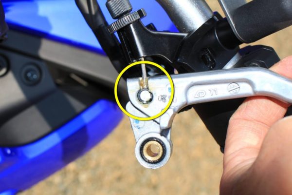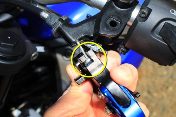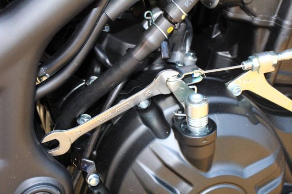 まずはクラッチレバーを握ってからクラッチのところにスパナを挟んで戻らない様にしましょう。