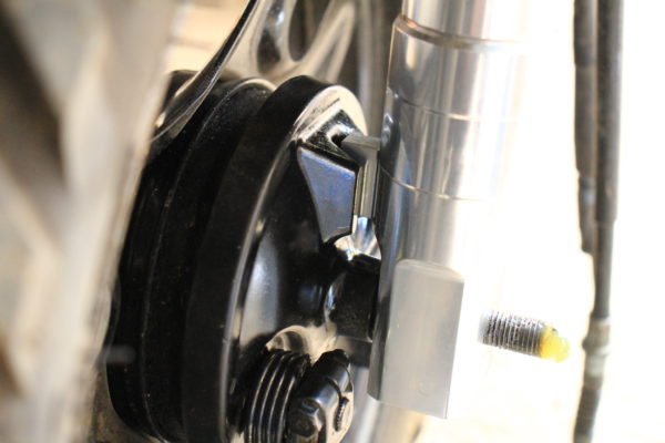 ボルトをしっかり閉め込んで取付完了です。なお、フロントフォークには左右がありますので注意しましょう。下の方に出っ張りがあるのが左側です。