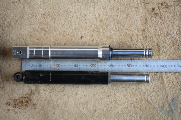 ちなみに、外した純正同等品のフロントフォークと新しいオイルダンパー式のフロントフォークの長さを比較してみました。