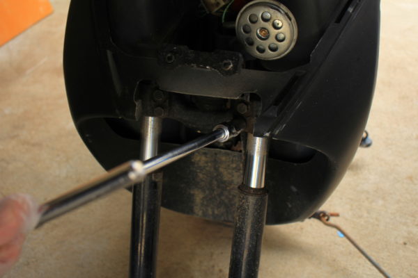 フロントフォークを固定している二本のボルトが見えるはずです。下のボルトは緩めるだけ、上のボルトは引き抜きます。