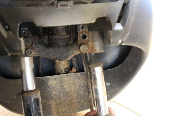 こんな感じです。上のボルトは引き抜いてしまわないとフロントフォークが外れません。