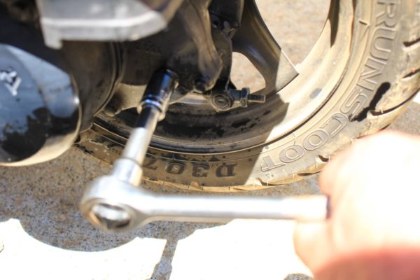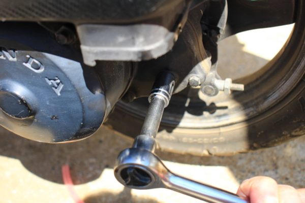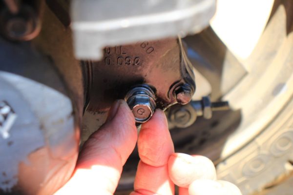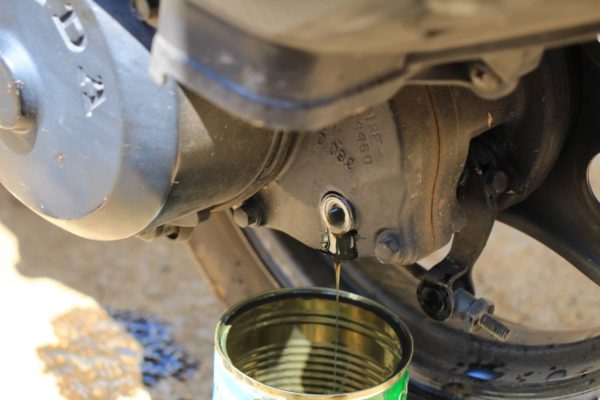 リヤのこの部分(写真ど真ん中のボルト)がギヤーオイルの補充口です。補充口から抜いて補充口から入れるしかなさそうなのでまずはこのボルトを外します。