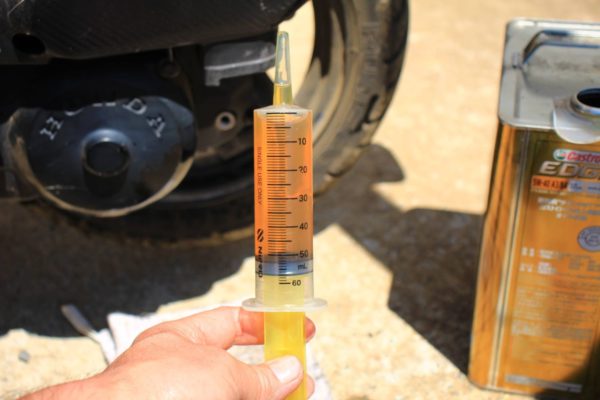 いよいよ新しいオイルを入れます。必要量は0.09ml(90cc)なので注射器で50と40の二回に分けて注入します。