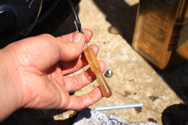 するとトロトロ〜っとギヤーオイルが出てくるのですが、穴の位置がこんなに上にあるのでチョットしか出てきません。