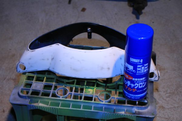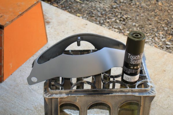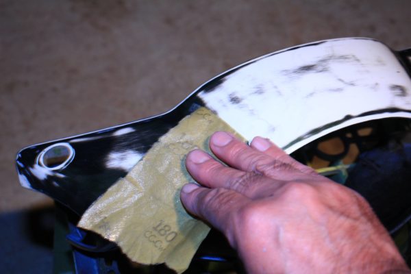まずは外装を全部外して耐水ペーパーで古い塗装を落とします。最初は180番などの荒いペーパーで大雑把に古い塗装を落とします。次に400番とか600番でザラザラをならし、最後は1000番とか1200番位で表面をきれいに仕上げます。