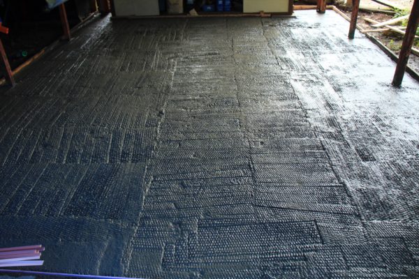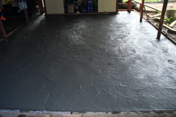 この段階ではコテの跡が盛大に出ていますが問題ありません。長靴で上がっても沈み込まない程度に硬化するまで少し休憩します。