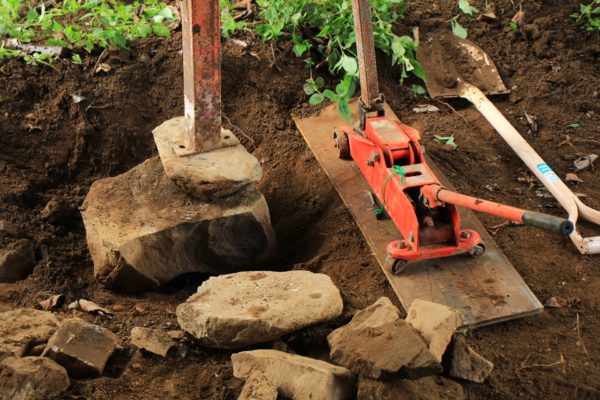 ジャッキをかけて柱を浮かせ、大きな石をドスンと入れてジャッキを下ろしました。この部分は40cm位掘ったと思います。