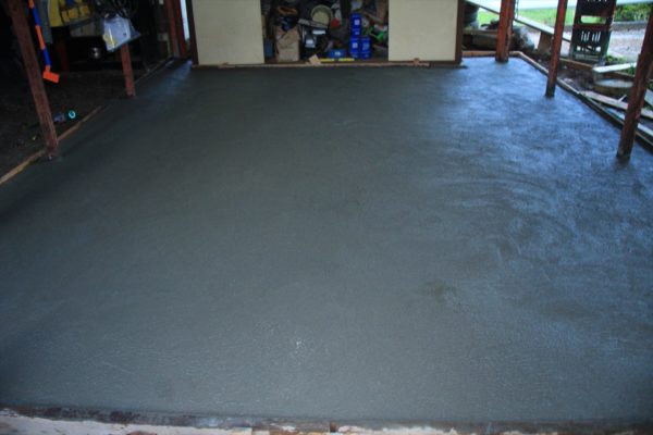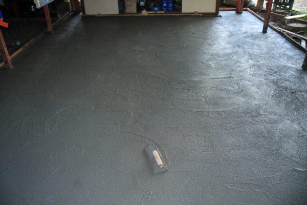 この段階ではコテの跡が盛大に出ていますが問題ありません。長靴で上がっても沈み込まない程度に硬化するまで少し休憩します。
