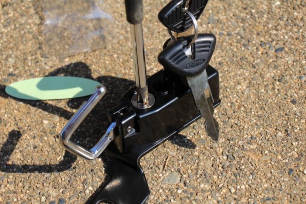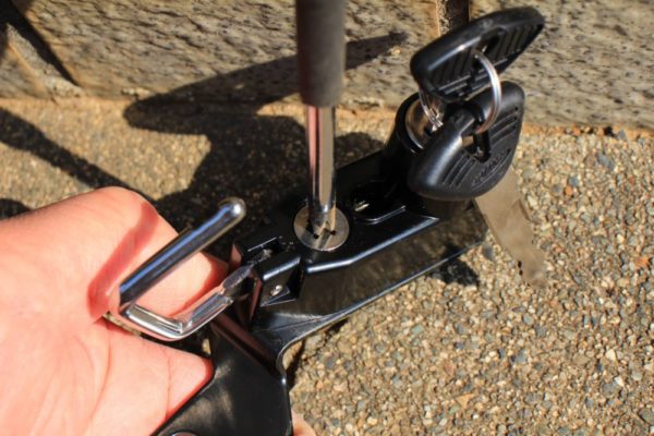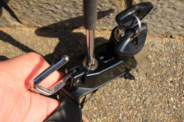 ヘルメットのDリングを通してカチッとロックするだけの簡単さでヘルメットを取り付ける事が出来ます。取り外すときもキーを回すだけでロックが外れます。