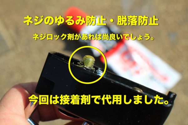 ネジロック剤を付けてしっかり締め付けましょう。私はネジロック剤を持っていなかったので接着剤で代用です。