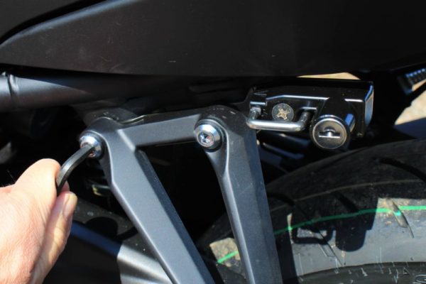 前に乗っていたMT-25(2018年型)もそうだったのですが、純正のヘルメットホルダーってタンデムシートを取り外して裏側の針金に引っ掛けて固定するタイプなので非常に使いにくいのです。