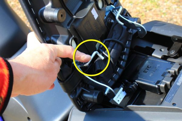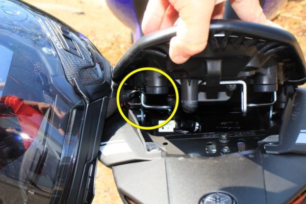 タンデムシートを開けるとここにフックが付いているのでここにヘルメットのDリングを引っ掛けて閉めれば良いのですが、私のヘルメットはシートを閉める事が出来ません。