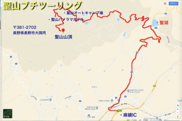 わかりやすく長野自動車道麻績(おみ)インターチェンジから聖山山頂までの道順を赤く塗っておきました。