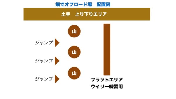 今までは普通に畑の状態で練習していたのですが、山を作ったりジャンプ台を作ったり、フラットなストレートを作ってウイリー走行の練習を行います。
