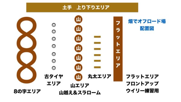 フラットエリアでウイリーの練習をしつつ前進します。次に山エリアに入って山の周りを連続スラロームで抜けたら丸太エリアで連続丸太越え!土手に上がって降りて八の字エリアに突入し、今度は連続山越えを行います。もう一度8の時を行って古タイヤエリアを越え、山エリアを反対から越えてフラットエリアに戻ります。