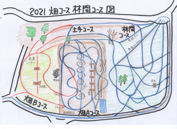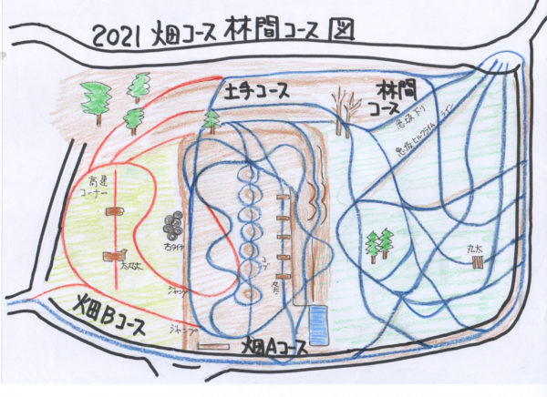 赤いラインが今回拡張した畑コースの部分です。Rの大きなコーナーを作って高速コーナーにしました。中には伐採した太い丸太を置いて太丸太越えの練習をします。