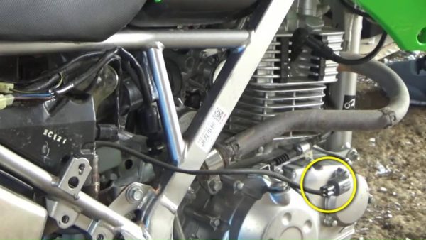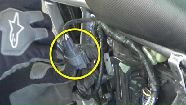 車体左側にO2センサーから伸びているケーブルがカプラーで接続されています。接続されたままカプラーごと上に持ち上げ、車体から離した状態にしてからカプラーを分離します。