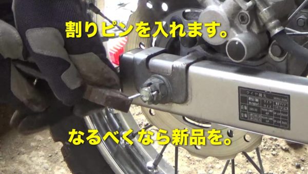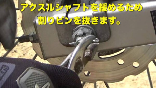 アクスルシャフトを締めてから割りピンを戻して弛み防止をしておきます。