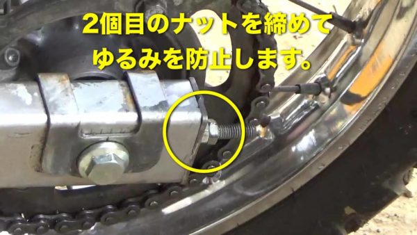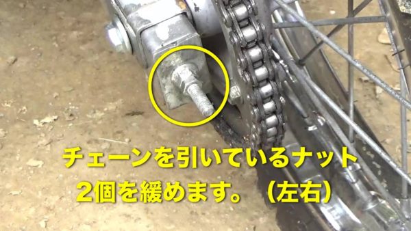チェーンを張っているナット2個を緩めます。最初に外側を緩めて次に内側を緩めてグラグラにします。全部外す必要はありません。左右緩めます。