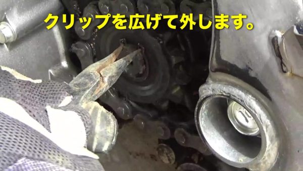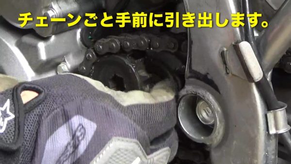 クリップが外れたらチェーンごとスプロケットを引っ張り出します。