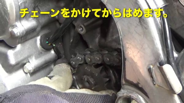 新しいスプロケットにチェーンを巻く様にかけてから押し込みます。