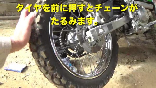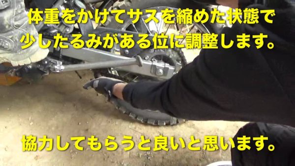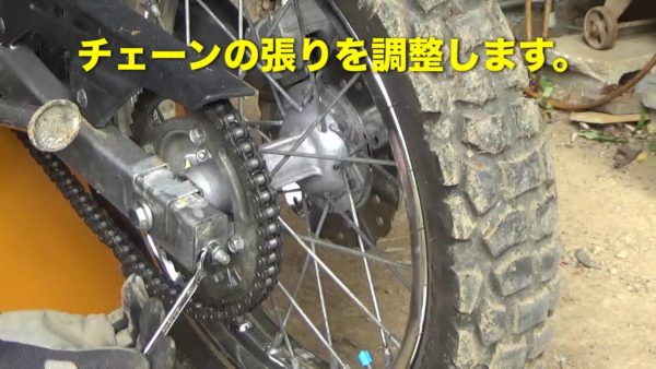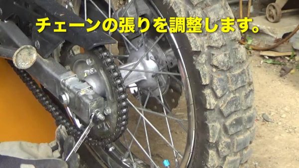 オフロード車なのでオンロード車より緩めに調整するのですが、ジャンプなどしてリヤサスが一番縮んだ時にチェーンに少し余裕がある様に調整しておくと良いです。