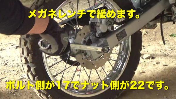 アクスルシャフトはメガネレンチを使って緩めます。ボルト側17ナット側22のメガネレンチで行います。