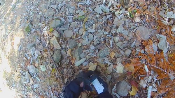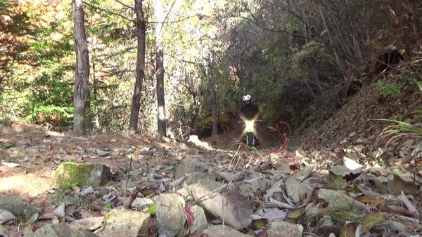 この先にあるガレ場も走ってみました。路面はこんな感じで角ばった石コロだらけの場所です。しかも急坂です。