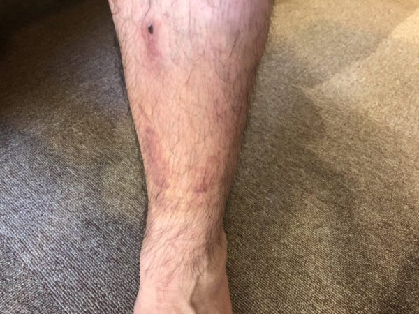 ぶつけてから一週間くらい経過した脛(スネ)です。擦り傷と打ち身のあとが紫色になっています。折れなくて良かった。