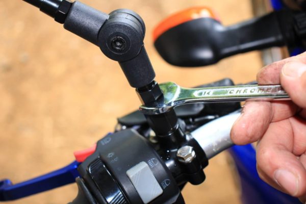 早速純正ミラーとはおさらばです。14のスパナを使ってミラー根元のネジを緩め、ミラー全体をクルクル回せば簡単に外れてしまいます。