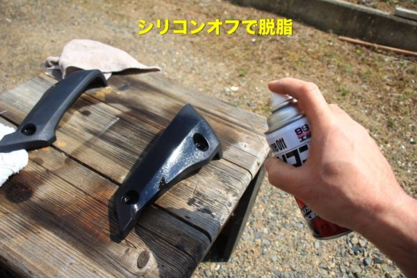 シリコンオフを全体に吹き付けて塗れた状態にします。塗れている状態でウエスを使って綺麗に拭き取って乾かします。これで脱脂処理はOKです。その後、表面を指で触らないように注意しましょう。指の脂でも塗料をはじいてしまう事があるのです。