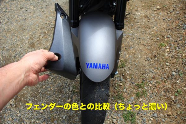 どちらかというとフロントフェンダーもSOFT99で塗り直してしまおうと思います。濃いガンメタの方がMT-03のイメージ的に合っています。YAMAHAシールは諦めよう。