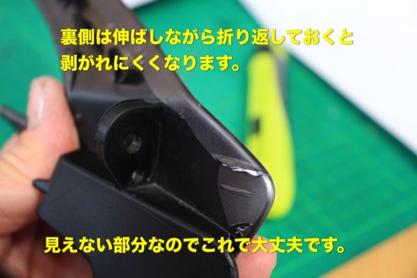 裏側は見立たないので熱を加えて引っ張って折り返して貼り付けておきました。