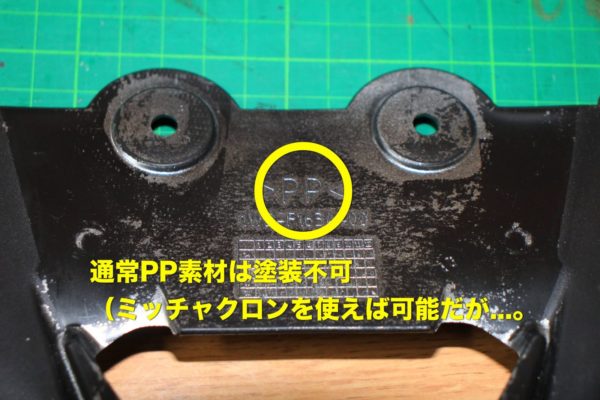 樹脂(プラスチック)塗装の前に注意しないといけないのはその素材です。通常PP素材は塗装できません。塗料が乾くとペロッと皮がむける様に剥がれてしまいます。ミッチャクロンというPP用の下地処理剤があるのですが、それでも剥がれてしまうという話も聞くため私は使った事がありません。(今度実験してみようかな)