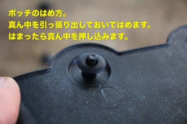 取り付ける時はボッチの真ん中の棒を手前に出しておいてから押し込んではめるだけです。