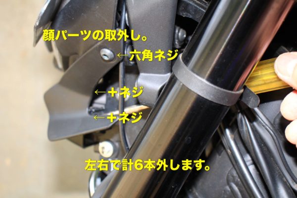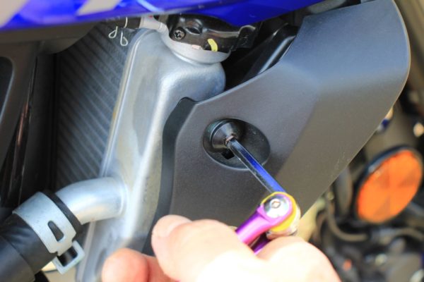 左右のラジエターカバーは六角ボルト4本で固定されています。(片側2本)これを回して取り外しましょう。