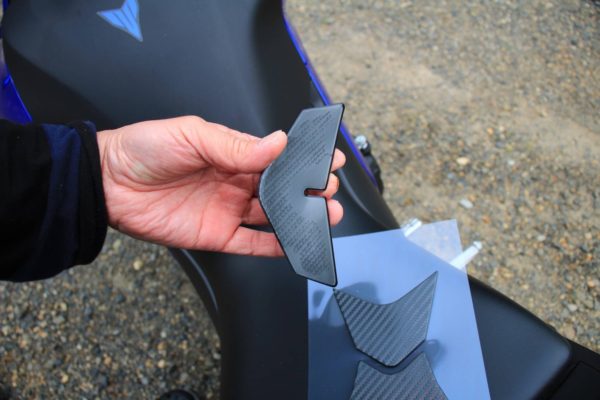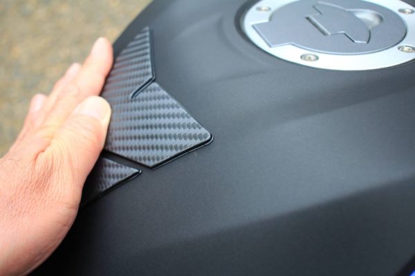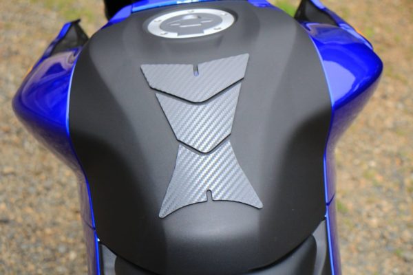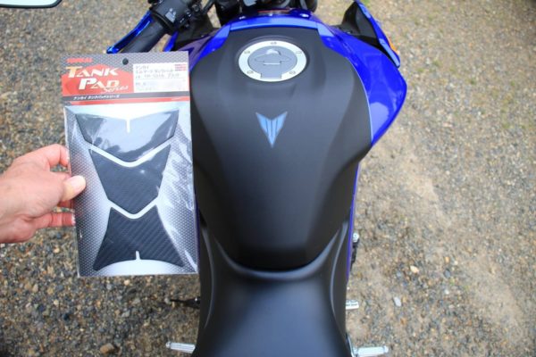 2018年型MT-25のタンクカバーは艶ありだったこともあってかあまり気にならなかったのですが、新型は艶消しになっているためか妙に目立ってしまいます。そこで南海部品さんのエルマードタンクパットTP-1016ブラックを購入しました。