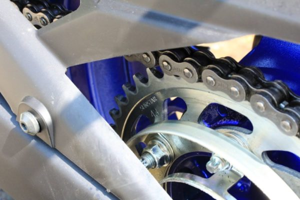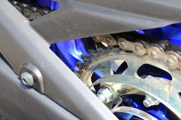 MT-03クラスならメンテナンススタンドがなくても、サイドスタンドを軸にリヤフェンダーを持ち上げた瞬間にタイヤを回せばチェーンのクリーニングや注油位は簡単に行えます。