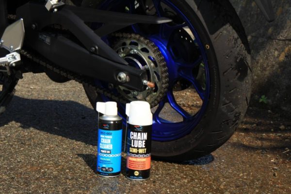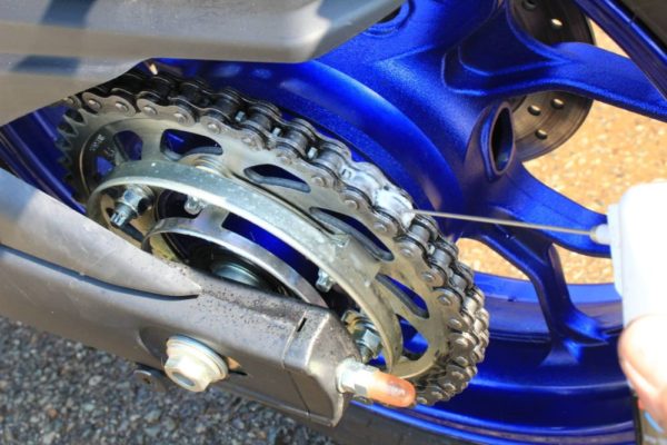エンジンの力を後輪に伝えるための大事な部品がドライブチェーンですが、チェーンルブを塗布して油分を切らさないようにしておきましょう。