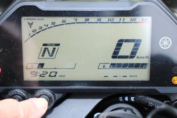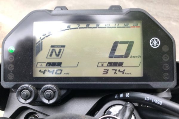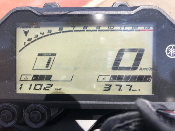 ちなみに2018年型MT-25の時は、のんびりツーリングで約40km/Lを記録しました。(燃費計がこれ以上表示できなかったのですが。)普段の通勤で35〜37km/L走ってくれていたので結構助かりました。
