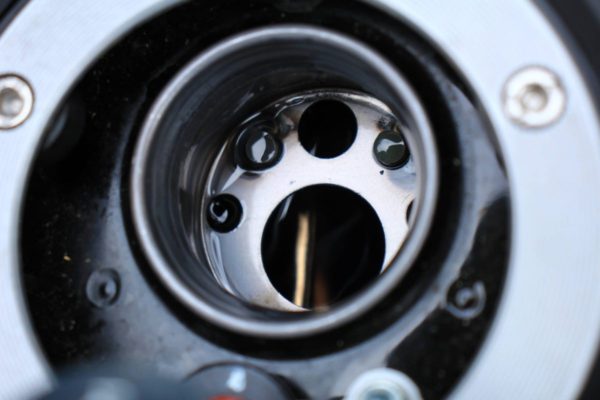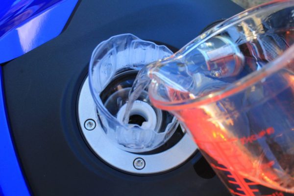 口元のキャップギリギリのこの位置まで入れておいて、帰ってきてからガソリンを計量しながら同じ位置まで戻します。入ったガソリンの量を走行距離で割れば燃費がわかります。