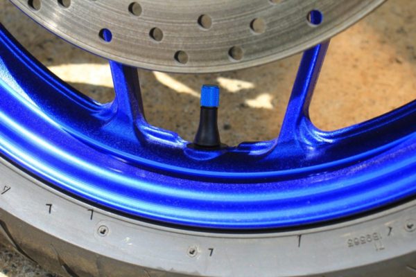 レッドバロンのバイクだったらブルーのキャップが付いています。窒素ガス充填の証です。