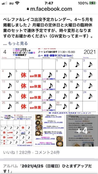 スマホで「ペレファカフェ」で検索すれば検索結果にフェイスブックが表示されます。
